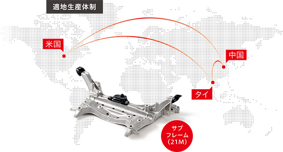 1980年に海外メーカーとの取引を開始。米国の自動車メーカーから技術や品質を高く評価され、日本のダイカストメーカーとしては初めて米国に生産拠点を設けました。この北米市場への進出を契機に、英国、中国(大連、常州)、メキシコ、タイへ進出を果たしました。多様化するお客様のニーズにスピーディーにお応えするために、地産地消を基本とした適地生産体制を構築。