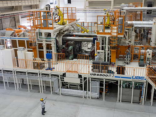 2025年3月、リョービは日本のダイカスト専業メーカーとしては初となる型締力6,500トンの超大型ダイカストマシンを菊川工場(静岡県)に導入し、大型部品の試作サービスを開始。100を超える複数の部品で構成されていた大型の車体部品を1つにするこの技術は、自動車の製造プロセスを変革し、大幅なリードタイム短縮や製造コスト低減、CO2排出量の削減に寄与します。