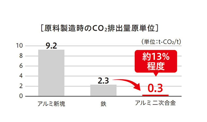 アルミ二次合金は、アルミをボーキサイトなどの鉱石から精錬する新地金(新塊)と比べると、その製造プロセスでわずか3%のCO2しか排出しません。鉄との比較でも13%程度のCO2排出量で製造できることから、環境負荷の低減にも有効な材料として、さまざまな産業から注目されています。