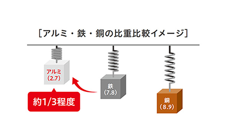 アルミニウムはとても軽い金属です。比重は2.7で、比重7.8の鉄に比べると約1/3の重さです。つまり、アルミニウムと鉄でそれぞれ同じ体積の形を作って重さを比べると、アルミニウムの重さは鉄の約1/3となります。同じ大きさの形でも、鉄よりアルミニウムの方が軽くなります。