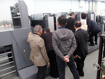 第二ショールーム設置のA全判オフセット印刷機 940ST-4+LED-UVによる印刷実演の見学