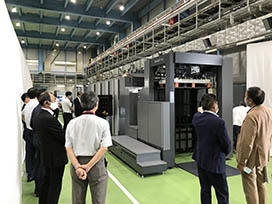 お客様は、印刷機のフレーム鋳物の加工に始まり、部品組立、印刷機組立から検収、出荷まで一貫生産する印刷機専用工場を見学していただきました。ものづくりの現場で実践している品質向上への取組みや、無駄を削減する改善活動などをご覧いただきました。