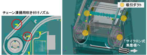 - パウダースプレー装置設置箇所の両側から吸引ダクトを設置します。