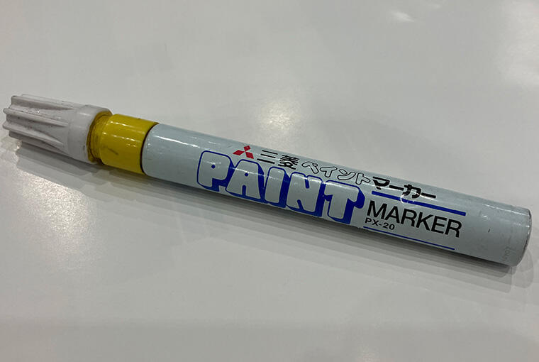 組立作業ではボルトの締め付けを行います。「ネジ締め4原則」というルールがあり、作業後は必ずボルトに黄色のマーカーでマーキングをします。品質ルールを遵守するためにも、いつも大切に持ち歩いています。